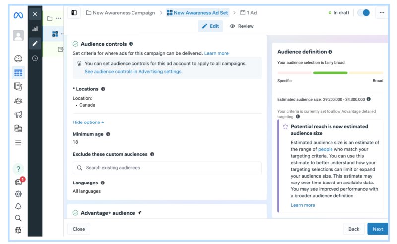 如果您刚刚开始,我们建议让 Facebook 的 AI 为您进行定位。根据他们的数据,Advantage+ 受众通常能以更低的成本获得更好的结果:大约“平均每次点击、潜在客户或着陆页浏览费用降低 28%”。