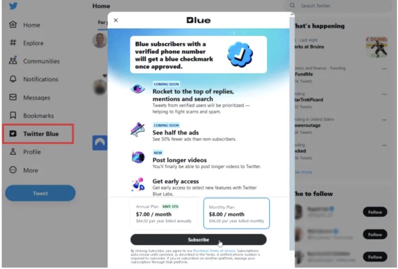 想要体验Twitter Blue吗?你可以选择以每月8美元或每年84美元(即每月7美元)的价格订阅。如果通过iOS或Android应用注册,你将被收取每月11美元的费用,这是由于苹果和谷歌的应用税。不过,你可以选择在网上注册,然后通过移动应用程序访问Twitter Blue,这样可以节省一些费用。
